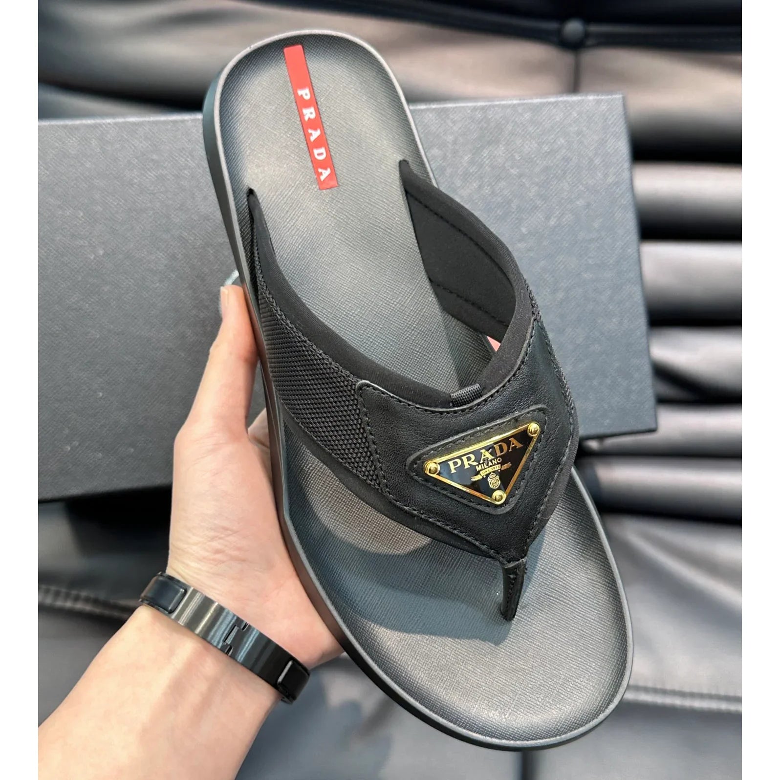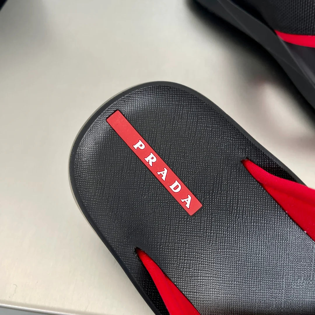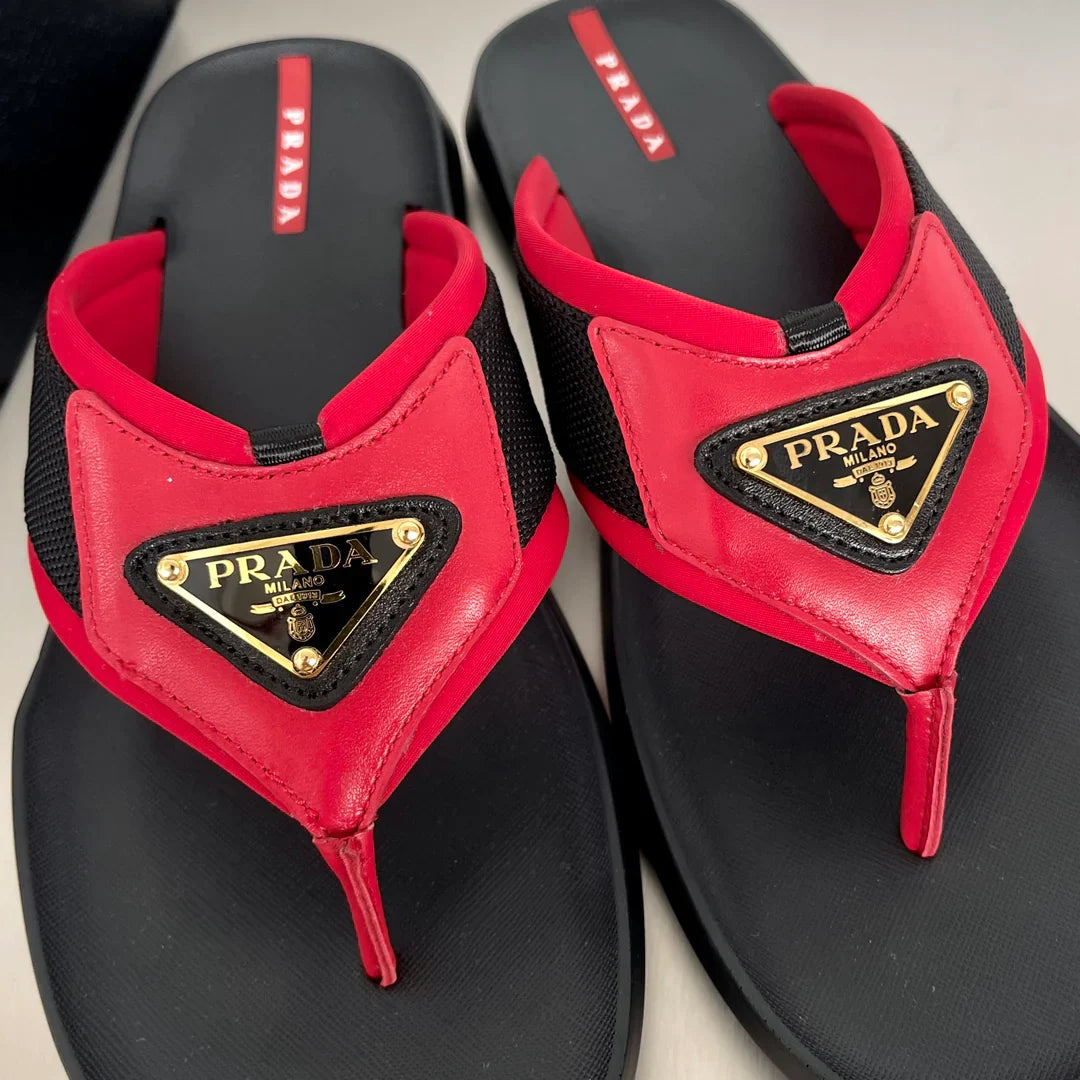 The prada classic triangle metal enamel logo embellished strap is made from herringbone criss-cross nylon webbing spliced with calfskin leather, and is finished with a lightweight, classic red label soft treaded rubber outsole for an interpretation of the brand's personality. The rubber sole adds a casual touch, ideal for holiday retreats.