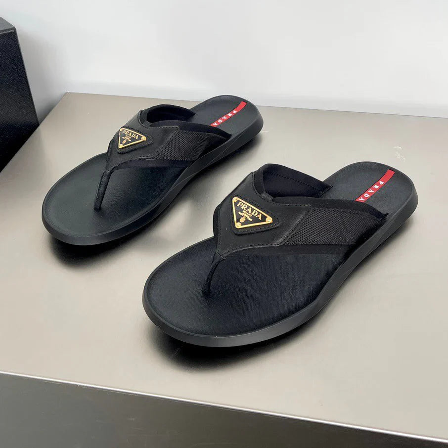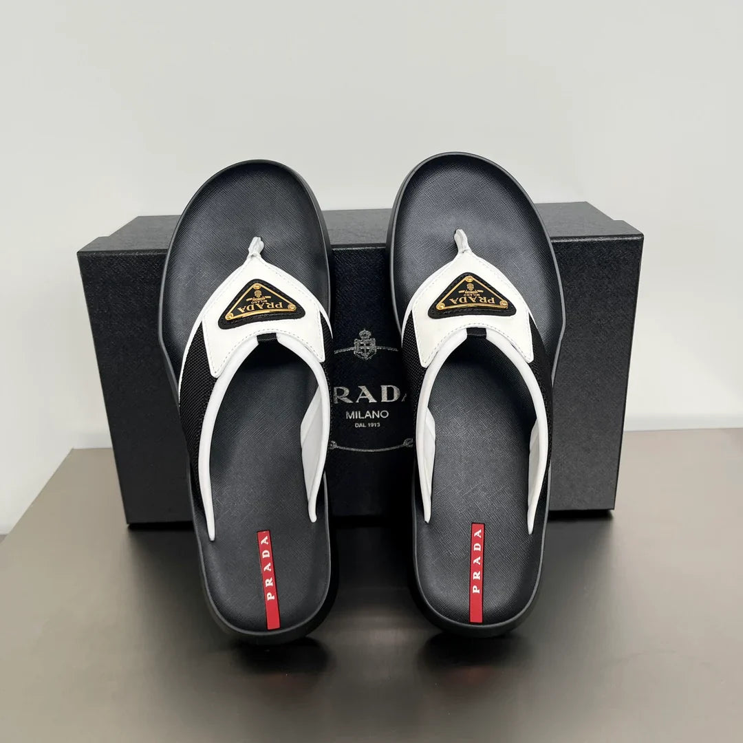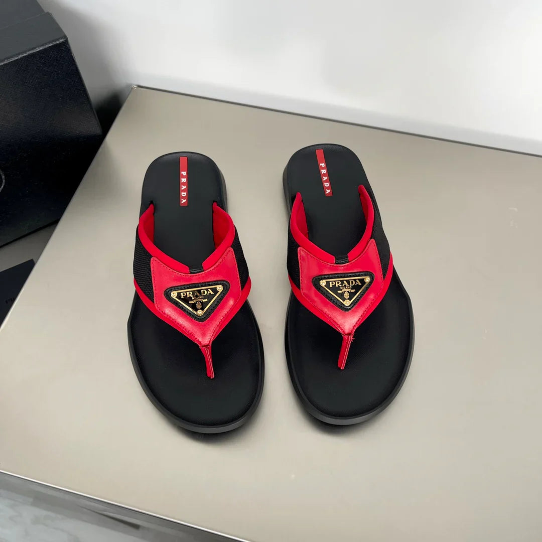 The prada classic triangle metal enamel logo embellished strap is made from herringbone criss-cross nylon webbing spliced with calfskin leather, and is finished with a lightweight, classic red label soft treaded rubber outsole for an interpretation of the brand's personality. The rubber sole adds a casual touch, ideal for holiday retreats.