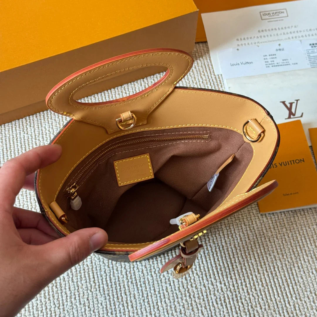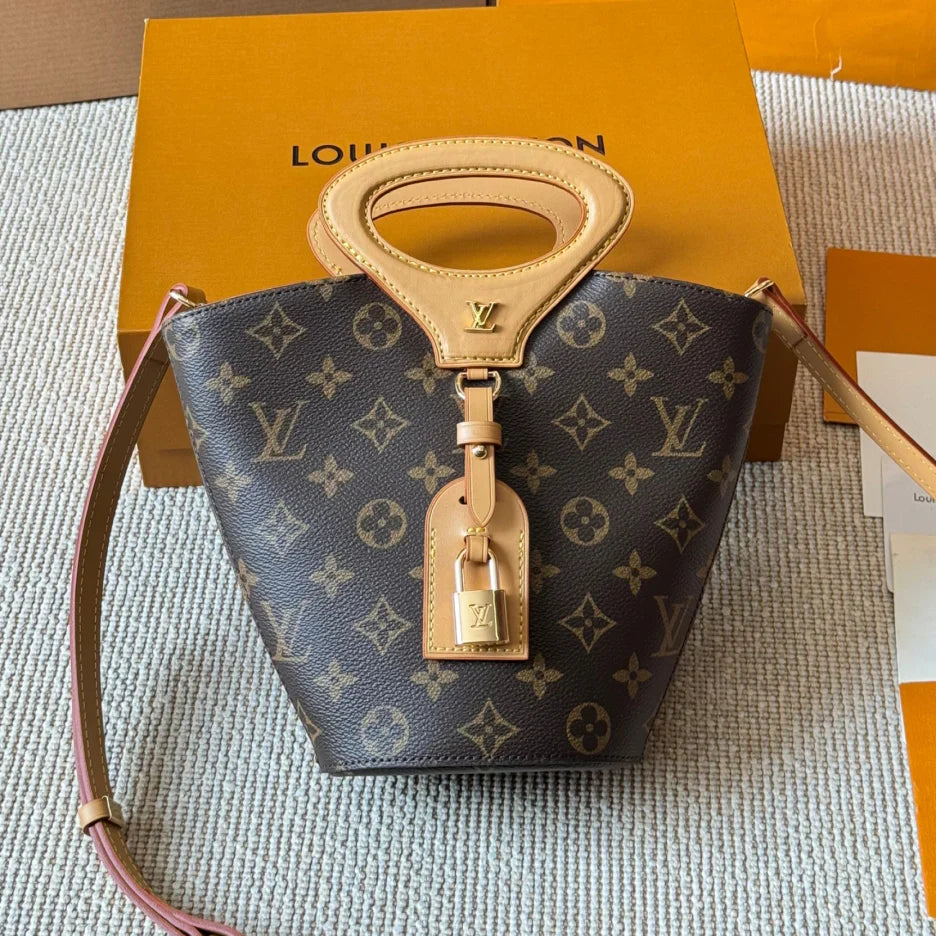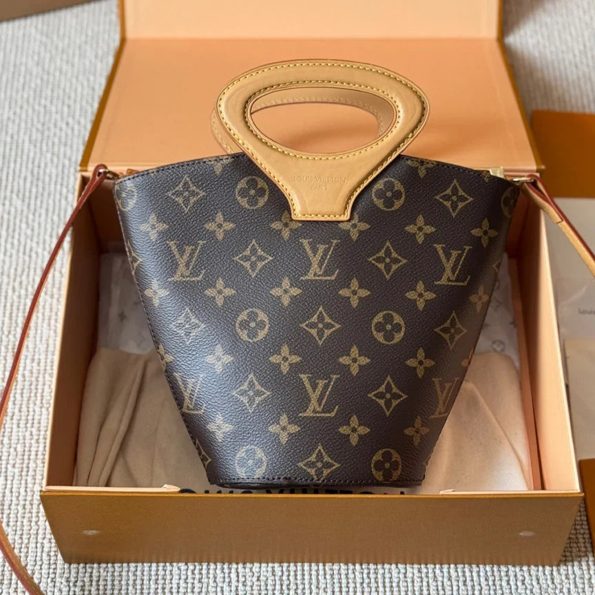 The Spring/Summer show featured the Rivage BB bag, a reinterpretation of the Noctambule bag launched in 1999 in a bucket silhouette in Monogram canvas. The suitcase-style handles, embossed padlock and leather luggage tag are classic elements that can be worn cross-body with the shoulder strap.